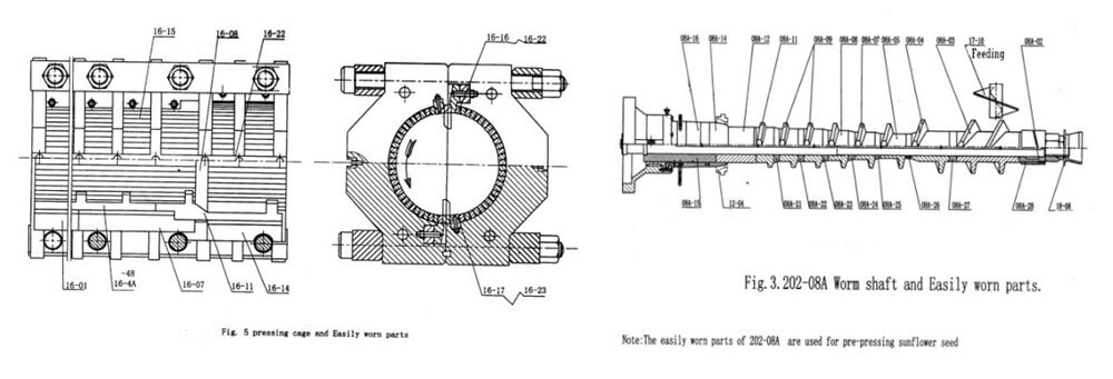 The squeezing cage and squeezing screw shaft are the main components of this equipment. Firstly, the material is pressed down by the feeding mechanism and continuously enters into the space between the squeezing cage & the squeezing screw shaft (called squeezing chamber). Due to the rotation of the squeezing screw shaft and the squeezing chamber gradually reduce the gap, the material is under intense pressure and most of which is pressed out of oil, next, the oil would flow out through the gap of squeeze cage.